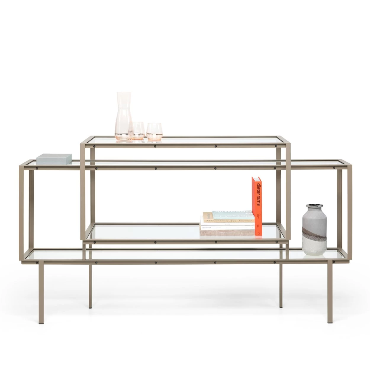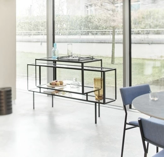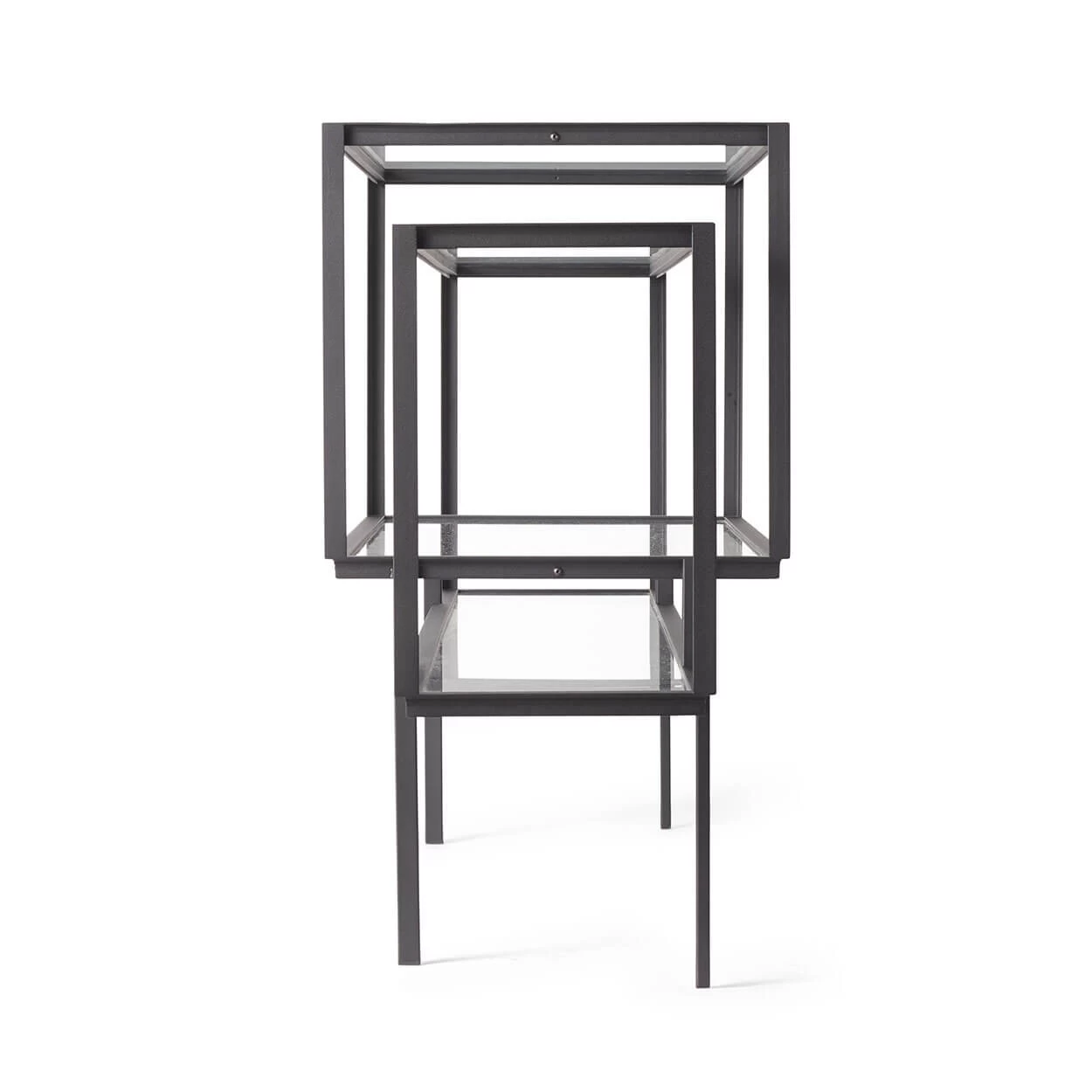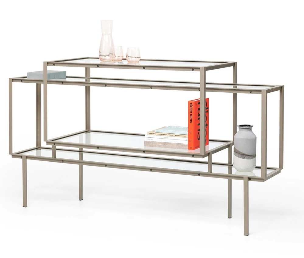 Der Rahmen des Kabinetts besteht aus schwarzen oder taupefarbigen Stahlprofilen, in welche die transparenten Glastablare eingelegt werden.