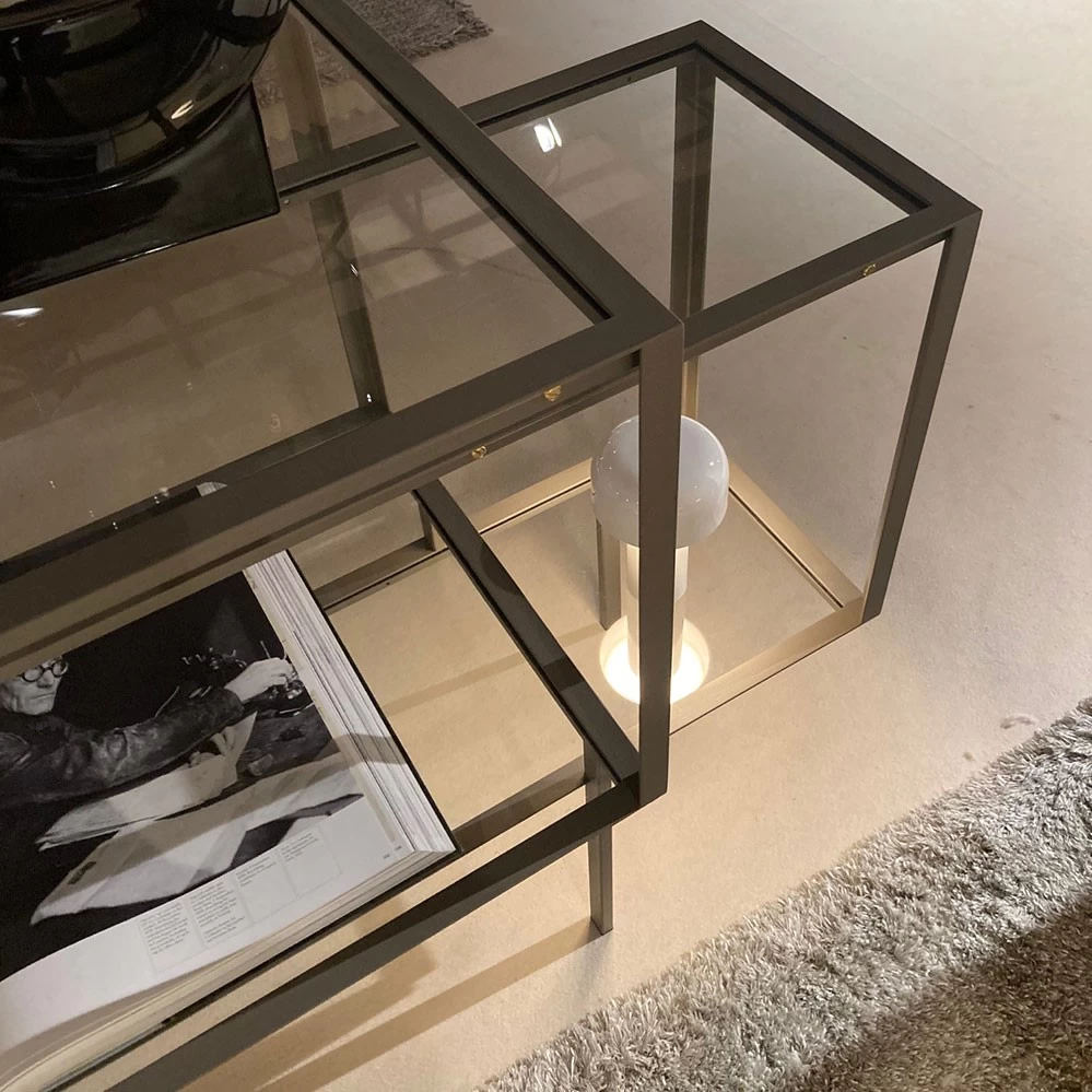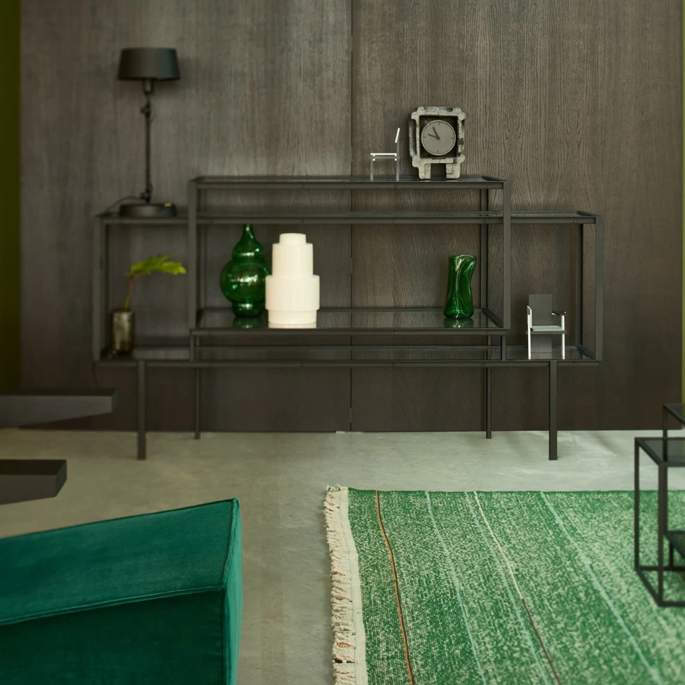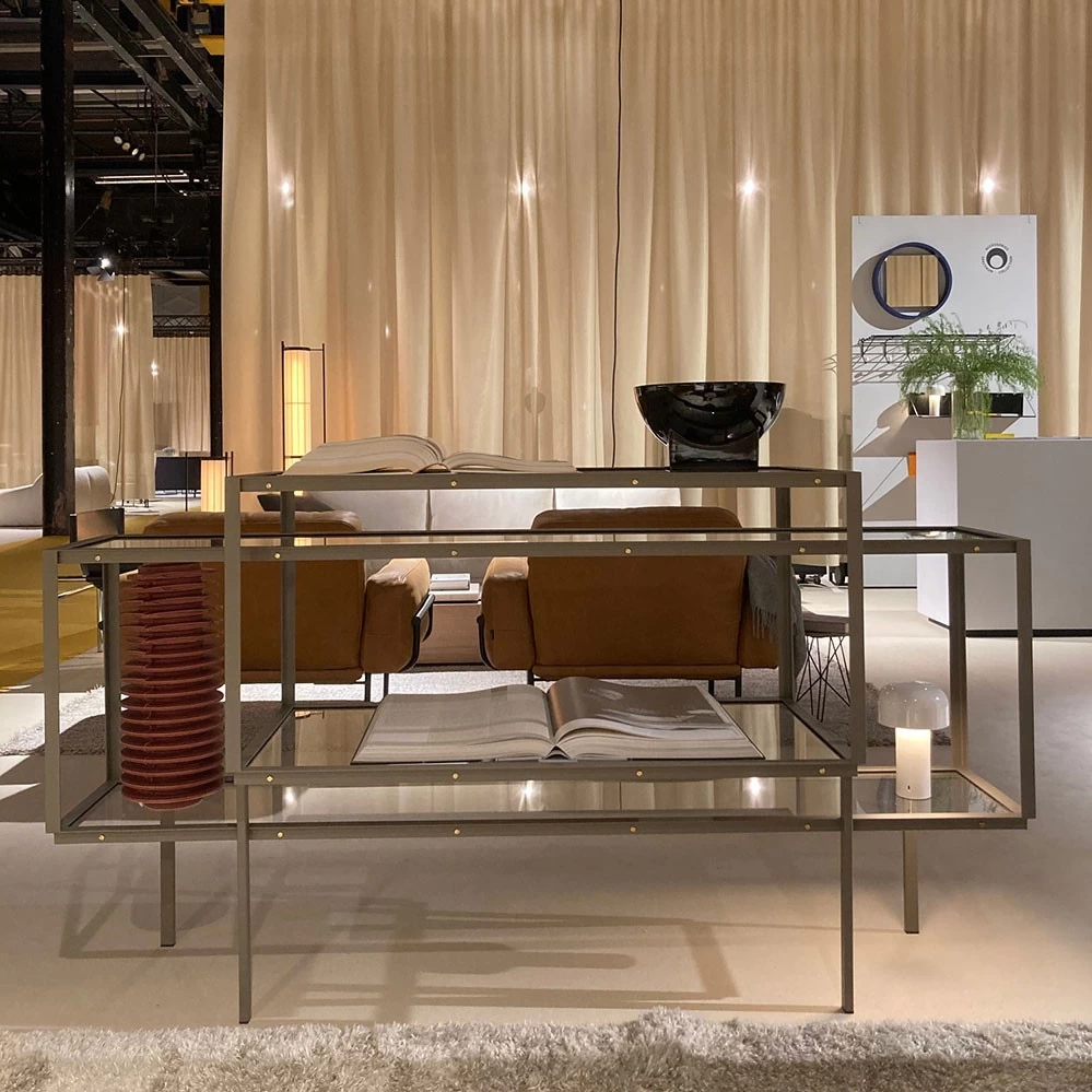 Der Rahmen des Kabinetts besteht aus schwarzen oder taupefarbigen Stahlprofilen, in welche die transparenten Glastablare eingelegt werden.