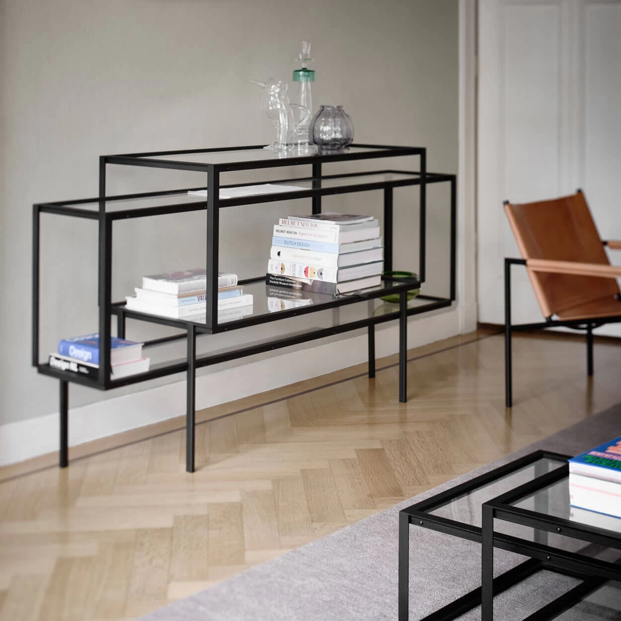Die Tangled Serie von Spectrum besteht aus vier Objekten: dem Couchtisch, dem Beistelltisch, dem Tangled Kabinett sowie einer Vitrine. Inspiriert wurde die niederländische Designerin und Goldschmiedin Carolina Wilcke bei dem Design aus dem Jahr 2015 von Stahlfenstern, wie sie früher bei historischen Industriebauten verwendet wurden. Dabei spielte sie mit der Formgebung der Stahlprofile, wodurch sich fast zwei transparente, ineinander greifende Module ergeben.