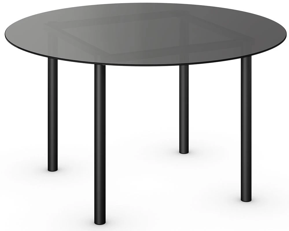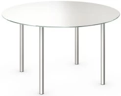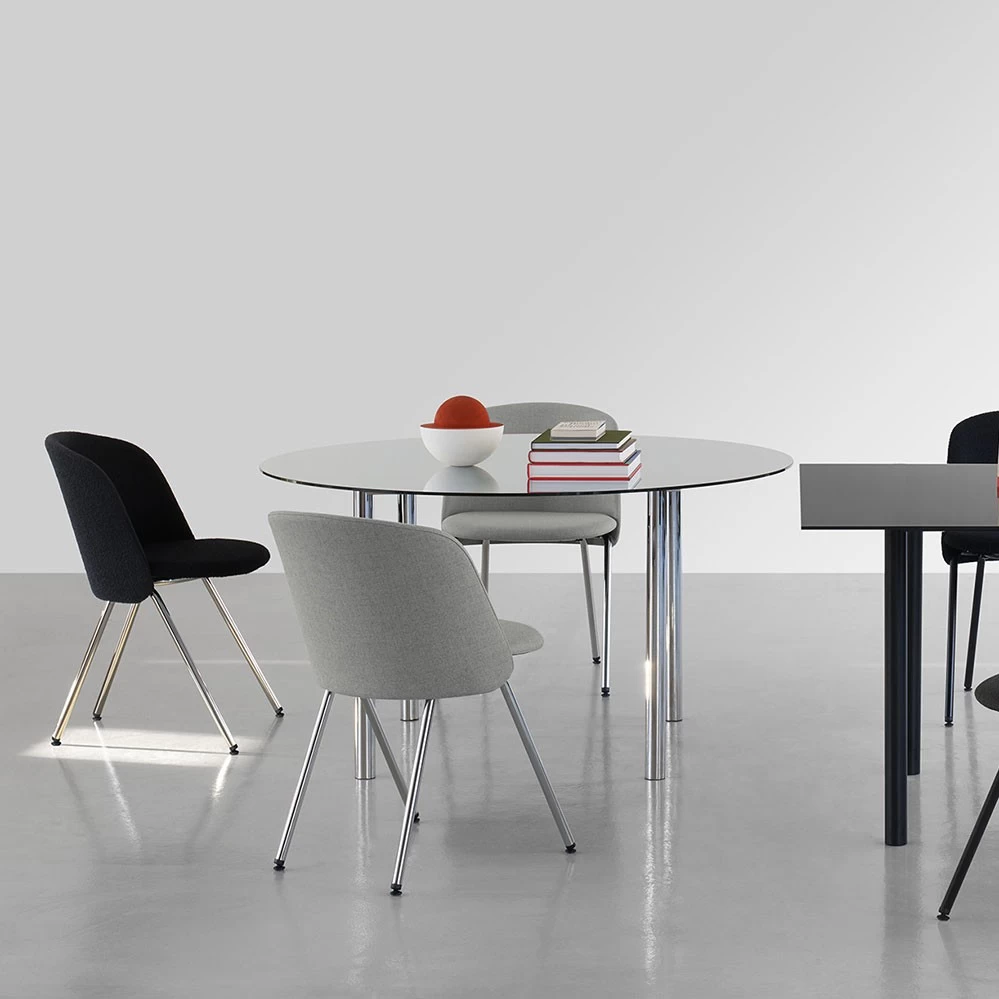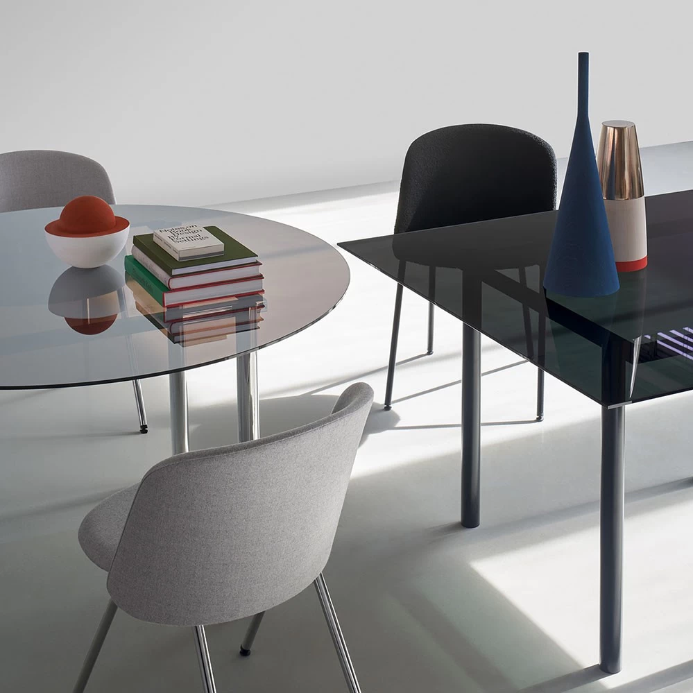 Der Theorem Glastisch ist eine gemeinsame Arbeit der beiden e15 Macher Philipp Mainzer und Farah Ebrahimi aus dem Jahr 2023. Der Entwurf zeichnet sich durch das visuelle Spiel mit klarer Geometrie und Materialität aus. Runde oder quadratische Platten aus verspiegeltem oder schwarz durchgefärbtem Glas werden als monochrome Kombination mit einem Gestell mit runden Stahlrohrbeinen in Chrom oder schwarz pulverbeschichtet angeboten. Durch die Ausgewogenheit der Abmessungen und Proportionen bietet der Tisch bequem Platz für vier Personen und ermöglicht eine Vielzahl von verspielten Inszenierungen. Die Tischplatten werden als Maßanfertigung auch in verschiedenen Steinen und Massivholz angeboten.