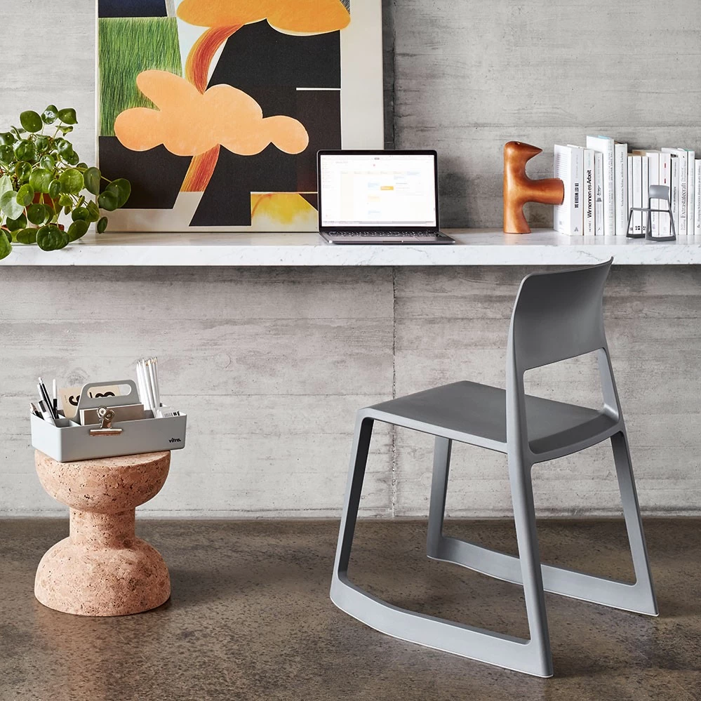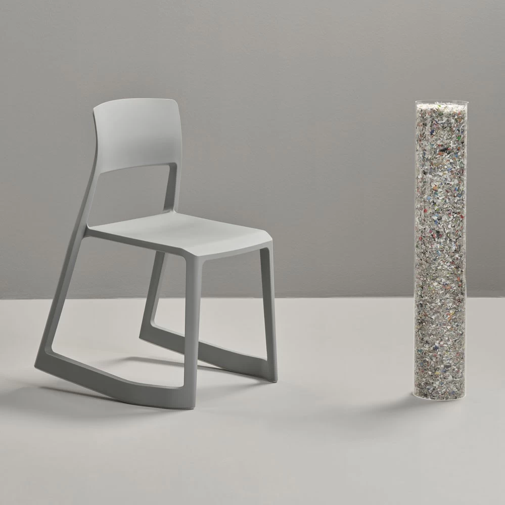 Im November 2020 präsentierte Vitra den Tip Ton Chair von Barber Osgerby in einer neuen, nachhaltigen Variante. Denn der Stuhl wird aus recycelten Kunststoffresten gefertigt und ist nach Jahren im Gebrauch selbst wieder zu 100% recycelbar.