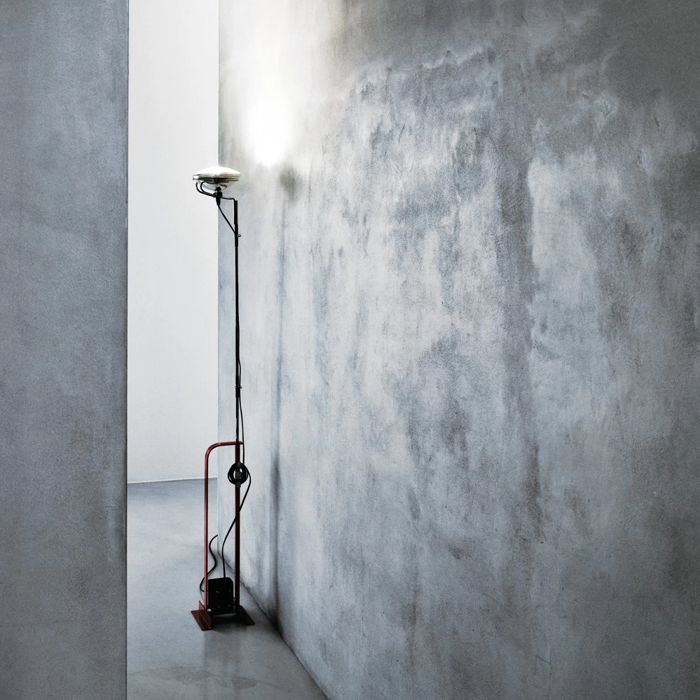 Die Toio von Flos ist sicherlich mit der konstruktivistische Entwurf von Achille und Pier Giacomo Castiglioni aus dem Jahr 1962. Wie bei vielen ihrer Entwürfe ließen sich die beiden Brüder dabei von Alltagsgegenständen inspirieren: Ein Autoscheinwerfer wirft das Licht an die Decke, der ursprüngliche Transformator diente gleichzeitig als Fuß, als Halter für das Kabel dienen Ösen von Angeln. Angeblich gingen die beiden Castiglioni Brüder damals in eine Garage und entwickelten aus den dort vorgefundenen Gegenständen die erste Toio. Ursprünglich erfolgte die erste Produktion bei Flos mit einem 300 Watt Autoscheinwerfer, der aus den USA importiert wurde und zur Lichtquelle der Leuchte wurde. Der Transformator für die Lichtquelle ist gleichzeitig der Fuß der Leuchte und unterstützt somit auf solide Weise ihre Standfestigkeit. Der sechseckige Schaft – „leicht wie eine Angelrute“ – wird mit einer Schraube in der gewünschten Höhe gehalten. Das elektrische Kabel wird von drei Ringen wie bei einer Angelrute geführt.