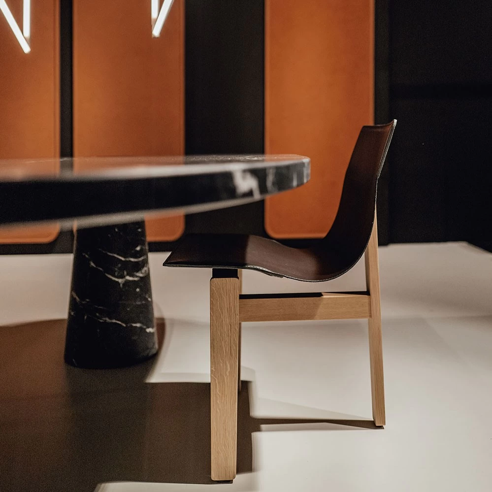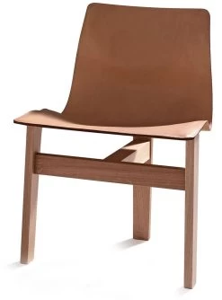 1978 entwarf Angelo Mangiarotti den dreibeinigen TRE 3 Stuhl mit einer Sitzschale aus Leder. Gefertigt wird das skulturale und bequeme Sitzmöbel von Agapecasa im Rahmen der Mangiarotti Kollektion.