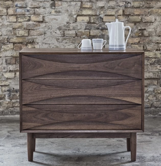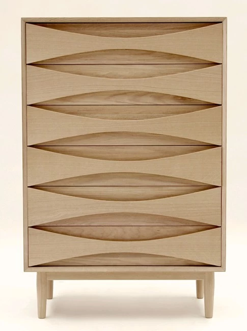 Die hohe Kommode Tall Boy zählt zu einer Serie, die Arne Vodder ursprünglich in den 1950er Jahren für den dänischen Hersteller Sibast entwarf, die heutige Variante wird seit 2014 von Snedkergaarden produziert. Nachdem die Serie auf der Triennale in Mailand ausgezeichnet wurde, erhielt sie damals schnell diesen Spitznamen. Ein besonderes Detail ist dabei die Formgebung der Schubladen, die ohne Extragriffe auskommen.