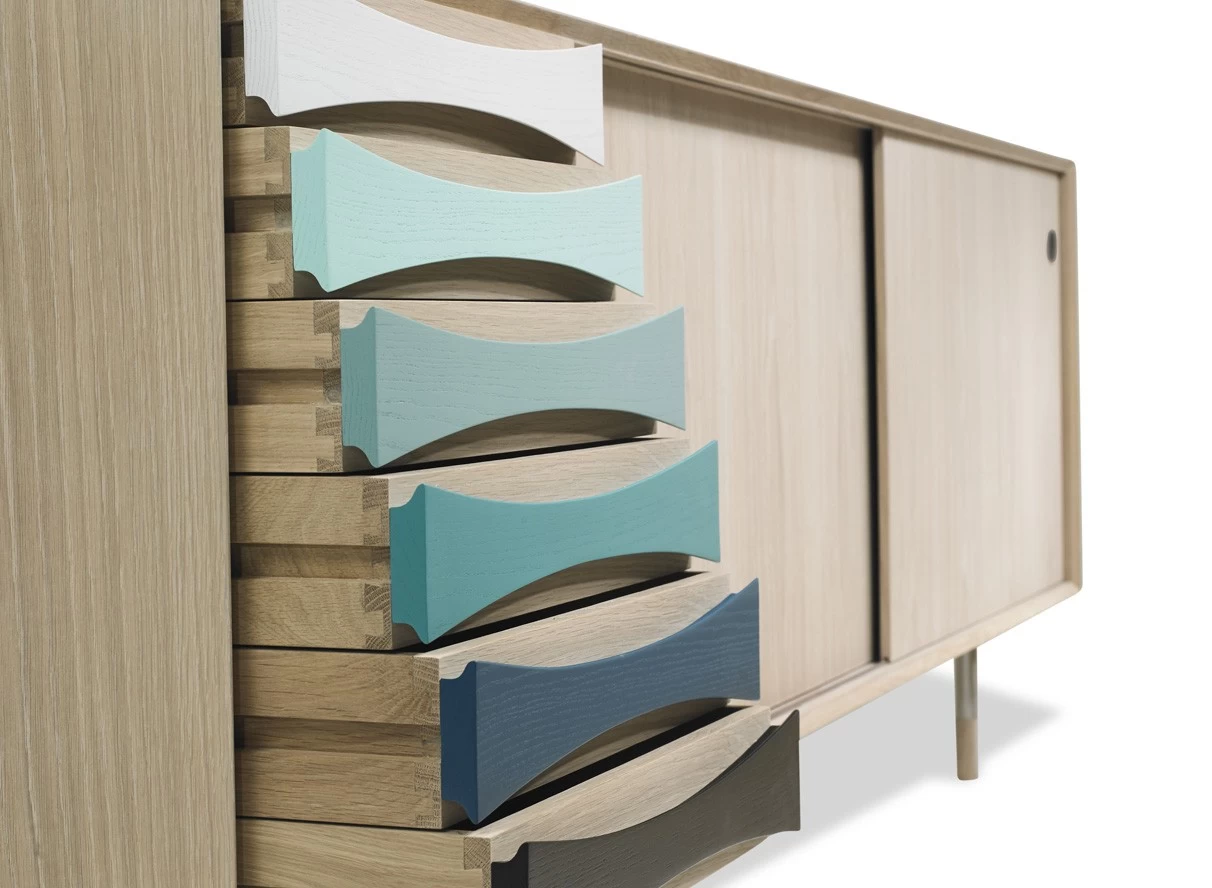 Seit den 1960er Jahren gibt es die farbige Variante des Triennale Sideboards AV01 von Arne Vodder. Dabei sind die einzelnen Schubladen nach einem von Finn Juhl inspirierten Farbschema farbig abgesetzt. 2017 hat Snedkergaarden diese ikonische Variante auf unserer Anraten wieder aufgelegt – und dies ohne Aufpreis! Erhältlich ist das farbige Vodder Sideboard in folgenden beiden Farbkombinationen: