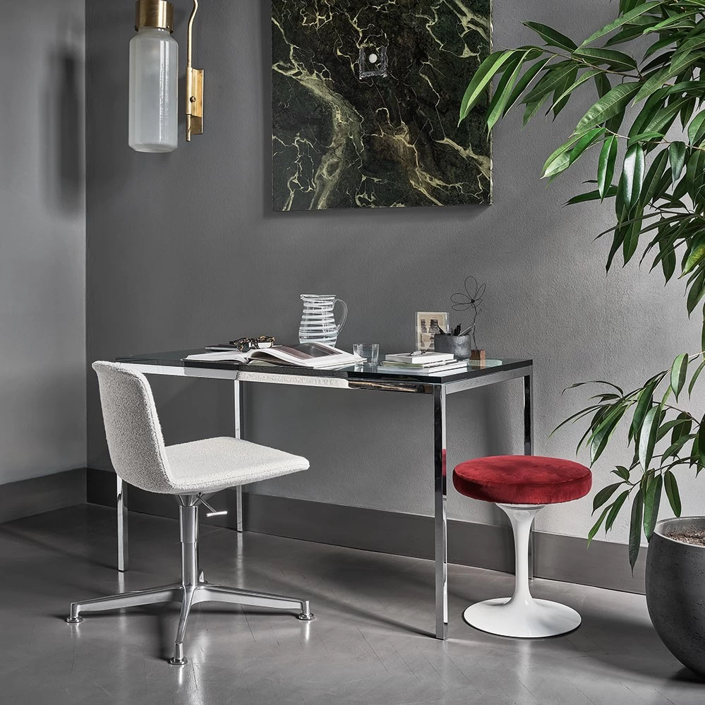 Passend zu seinem berühmten Tulpenstuhl schuf Eero Saarinen um 1957 gleichzeitig den drehbaren Hocker für die Pedestal Kollektion von Knoll International. Erhältlich sind die Saarinen Hocker bei Knoll wahlweise mit schwarzem oder weißem Aluminiumgestell. Als Basis bieten wir den Saarinen Hocker in ausgewählten Stoffen und Ausführugen an, weitere Versionen oder in Leder gerne auf Anfrage.