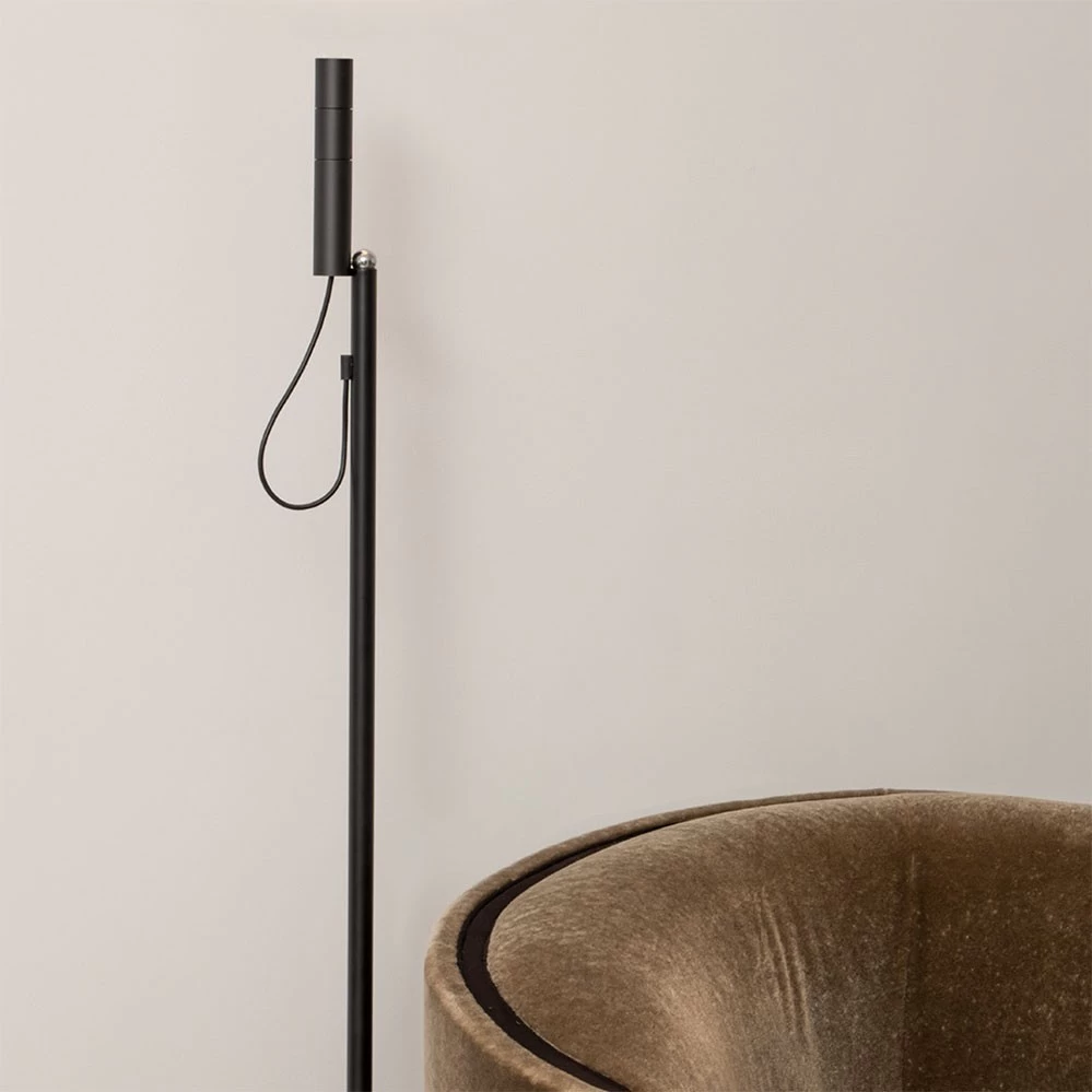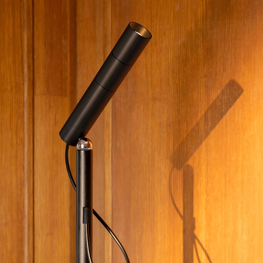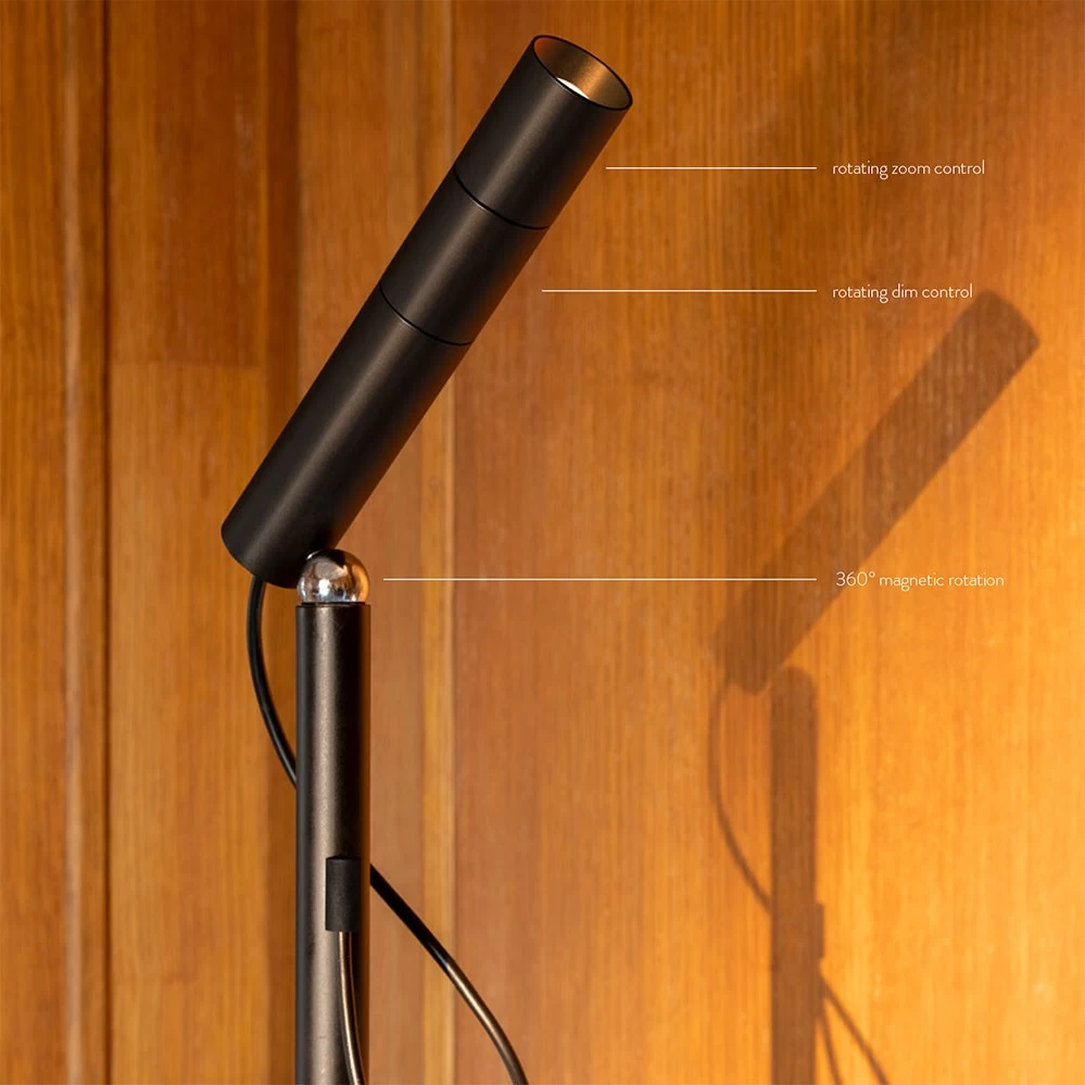 Die Stehleuchte Type von Guillaume Bloget aus dem Jahr 2022 hat uns auf Anhieb überzeugt. Die raffinierte und technische komplexe Leuchte erinnert vom Konzept an Lichtklassiker von Gino Sarfatti, kombiniert mit den neuesten Errungenschaften im Bereich der Optik und einer besonderen Dimmfunktion. eine einfache Handbewegung am Reflektorstrahler kann das Licht lenken, seine Intensität variieren und den Abstrahlwinkel einstellen (siehe dritte Abbildung). Die Eigenschaften des Strahlers laufen dort zusammen, wo die Hand des Nutzers den Spot auf natürliche Weise lenkt. Das um 360 Grad zu drehende magnetische Kugelgelenk erlaubt es, den Strahler beliebig zu schwenken und so die Intensität zu verändern.