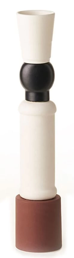 Die totemartige hohe Vase 10600 ist ein Entwurf der Memphis-Mitbegründerin Nathalie Du Pasquier und entstand 2018 im Rahmen einer 10teiligen Keramikserie für Bitossi, wobei jede Keramik anders geformt ist und über eine andere Farbgebung verfügt. Grundlagen für diese Serie waren drei stapelbare und limitierte Keramiken, die die Designerin schon früher für Bitossi entwickelt hatte.