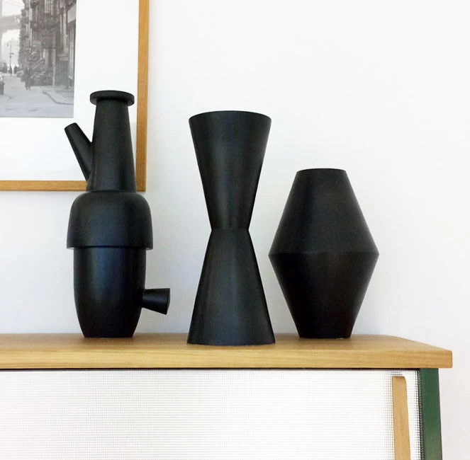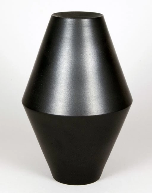 Die rautenförmige Vase von Lutz Könecke aus dem Jahr 2015 überzeugt durch ihre Reduktion, verbunden mit der Eleganz einer matten, schwarzen Glasur. Das Pendant dazu ist die höhere, spindelförmige Vase.