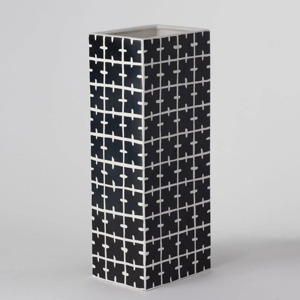 Die rechteckige 38 cm hohe Vase Rettangolare Decoro a Cera ist ein Entwurf von Alvino Bagni aus den 1960er Jahren und wurde 2020 von Nuove Forme neu aufgelegt. Hinter dem Familienunternehmen Nuoveforme stehen Gianfranco Ghiretti und Maria Chiara Ghiretti, die Enkelin von Alvino Bagni.