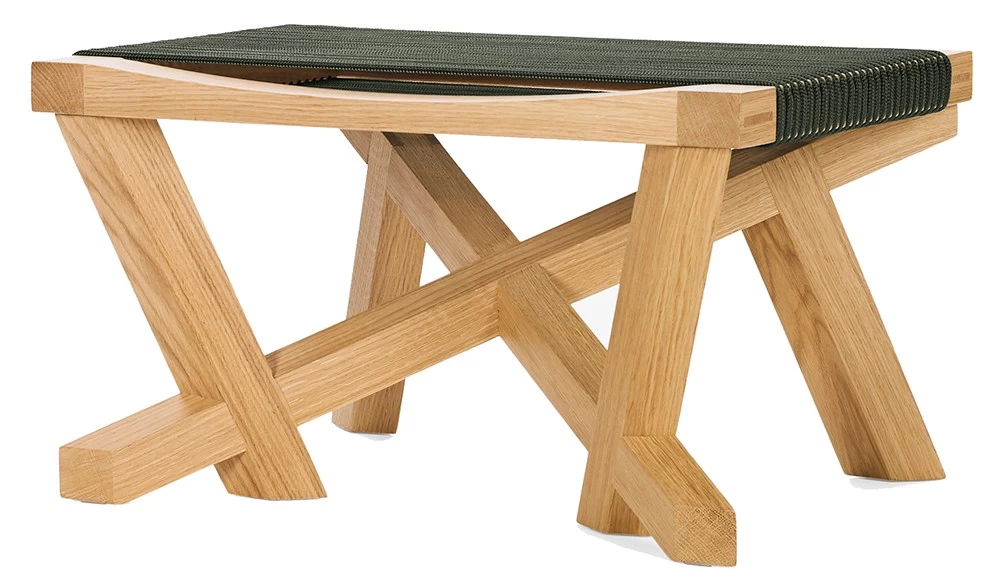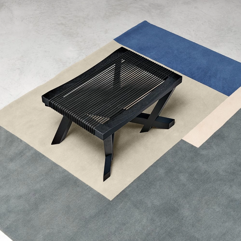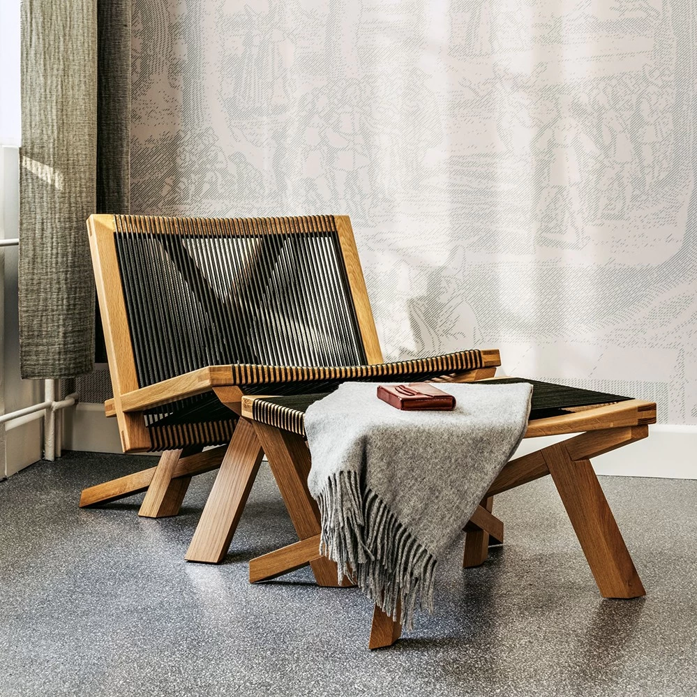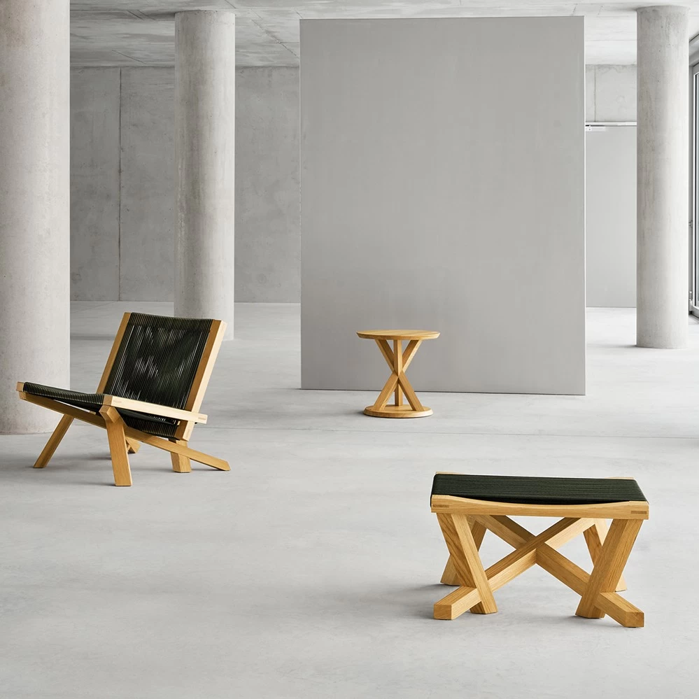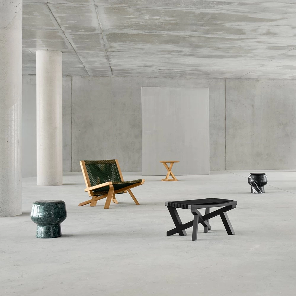 Ursprünglich für das Boutiquehotel Volkshaus in Basel entwarfen Herzog & de Meuron die gleichnamige Möbelserie, bestehend aus Hocker, Sessel und Beistelltisch. Inspiriert von traditionellen Holzverbindungen, verleiht das ausgeklügelte Konstruktionsprinzip den Möbeln ihren skulpturalen Charakter und architektonischen Ausdruck. 2024 legte ClassiCon die Möbel als Serie auf, wahlweise in der Ausführung Eiche natur oder schwarz gebeizt. Die naturfarbene Variante gibt es mit einer Bespannung in dunklem Salbeigrün; die schwarz gebeizte Variante mit schwarzer Bespannung. Auf Wunsch lässt sich der Volkshaus Stoolmit farblich abgestimmten losen Kissen aus Stoff oder Leder bestücken. Zum Einsatz kommen Lounge Chair und Stool überall dort, wo entspanntes Sitzen gewünscht ist – in privaten Wohnräumen genauso wie repräsentativen Wartebereichen, Lobbys oder Hotelzimmern.