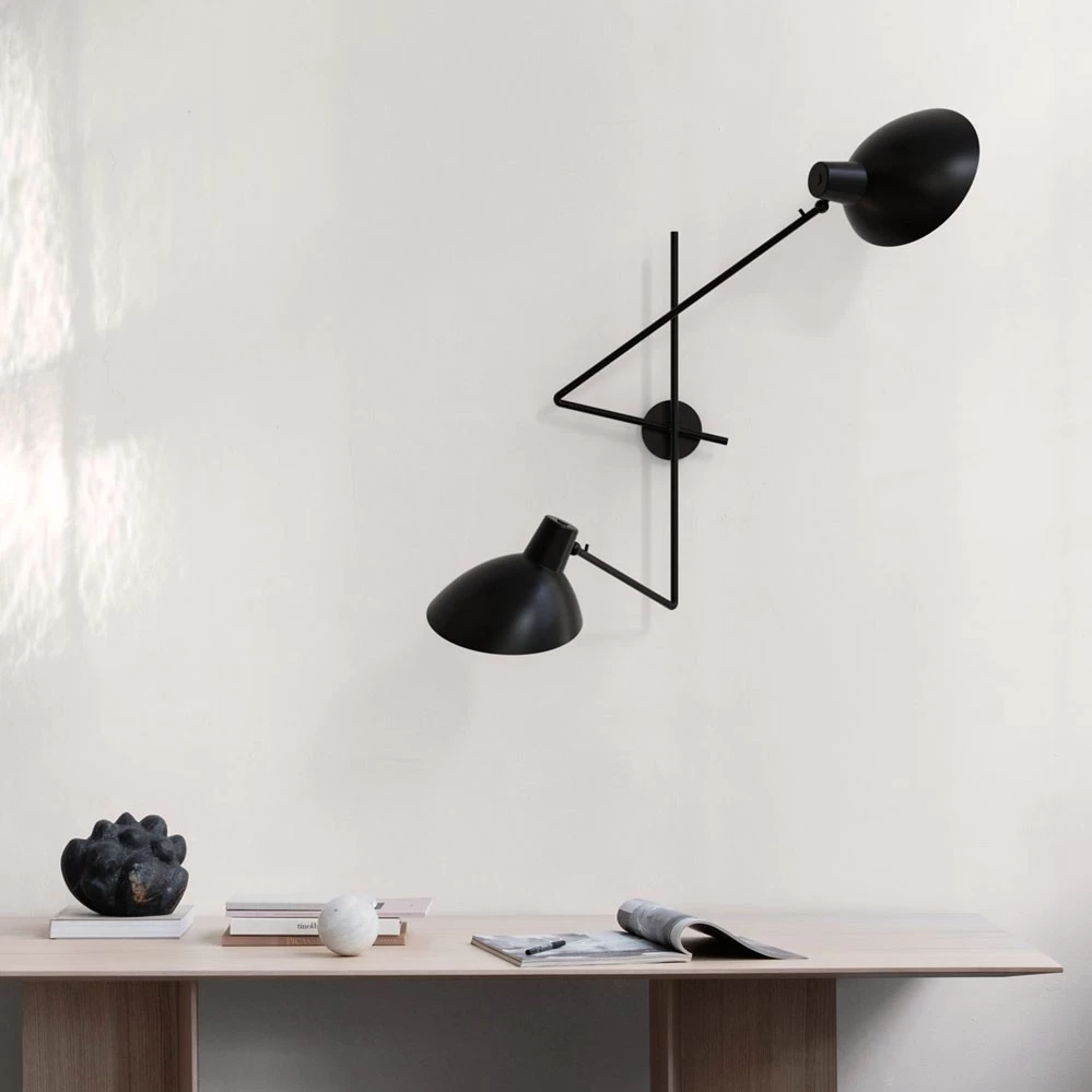 Ganz in Schwarz präsentiert sich diese Variante der VV Cinquanta Twin. Der Entwurf der eleganten Wandleuchte aus dem Jahr 1951 stammt von dem Architekten Vittoriano Viganò, der diese Leuchtenserie seinerzeit als Art Director bei Arteluce schuf.