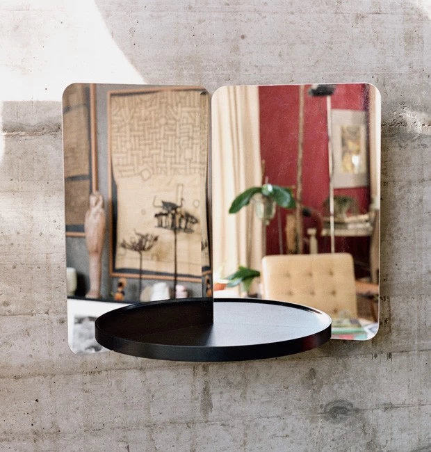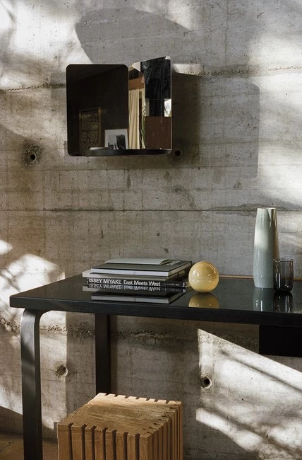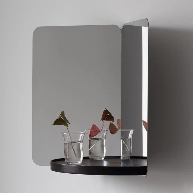 Der 124° Wandspiegel mit einer zusätzlichen Ablagefläche ist ein Entwurf des norwegischen Designers Daniel Rybakken aus dem Jahr 2017 für Artek. Insgesamt schuf Rybakken drei verschiedene Varianten des sehr skulpturalen Spiegels, wovon die hier angebotene Variante die mittlere Version ist. Die rundliche geformte Holzablage ist dabei wahlweise Esche klar oder schwarz lackiert. Alle Spiegel der 124° Serie haben dabei zwei Scheiben aus hochglanzpoliertem Stahlblech, die im Winkel von 124 Grad angeordnet sind und so den umgebenden Raumes ungewöhnlich reflektieren. Damit wirken die 124° Spiegel gleichzeitig als funktionale Gebrauchsgegenstände wie als ein Art-Design-Objekt. Durch ihre Formgebung können sie alternativ auch als stehender Spiegel verwendet werden.