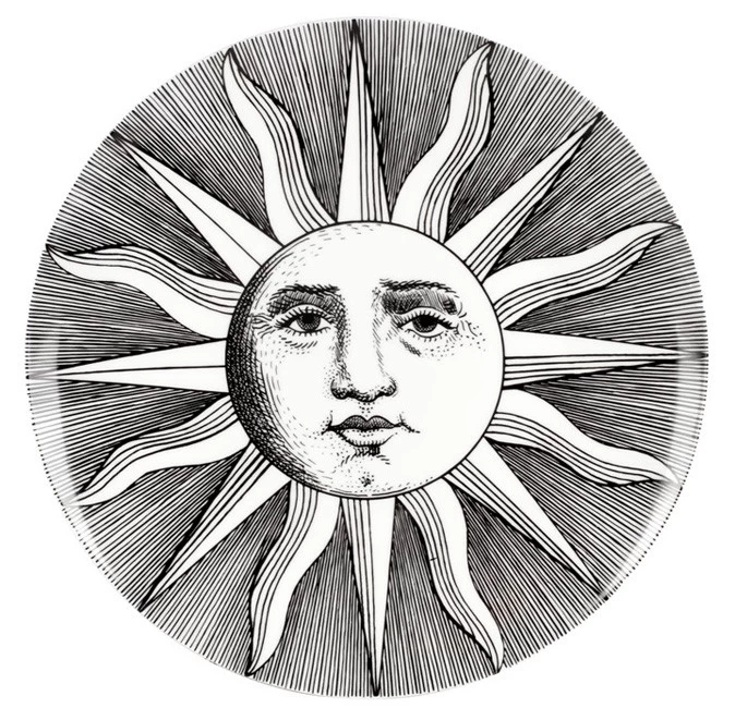 Der hier gezeigte Fornasetti Wandteller stammt aus der Soli e Lune Serie des Italieners. Wie der Namen es vermuten lässt, umfasst diese Serie verschiedene Sonnen- und Mondmotive (eine komplette Übersicht der acht Motive findet sich bei den Tischuntersetzern).