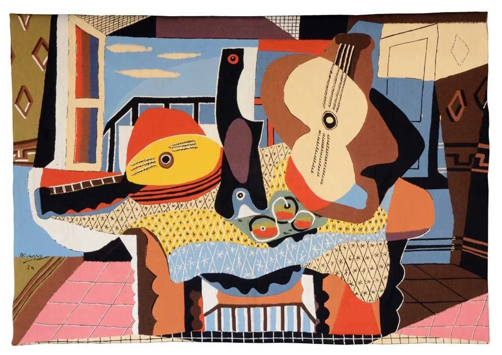 Der Jules Pansu Wandteppich Mandoline et Guitare basiert auf einem Ölgemälde von Pablo Picasso aus dem Jahr 1924, das Original befindet sich im Guggenheim Museum im spanischen Bilbao.