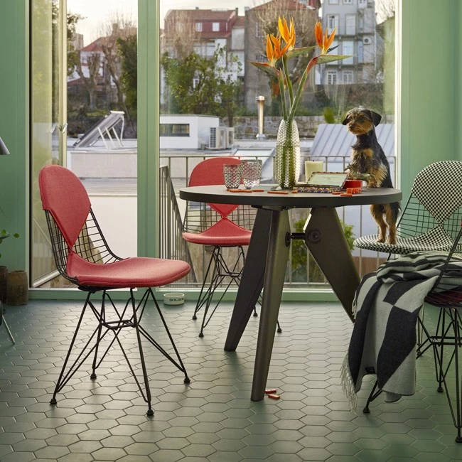 Der Eames Wire Chair DKR-2 mit seiner zweiteiligen Sitz- und Rückenpolsterung (der sogenannte Bikini-Bezug) überzeugt nicht nur durch die Formgebung – sondern gleichzeitig den ungewöhnlichen Sitzbezug. Erhältlich ist die Bikini Polsterung wahlweise in Stoff oder – gegen einen kleinen Aufpreis – in Leder. Seit Frühjahr 2023 ist der Wire Chair DKR bei Vitra in vier neuen Farben erhältlich, zur Wahl stehen Citron, Dunkelgrün, Eames Sea Foam Green und Himmelblau (gerne auf Anfrage)
